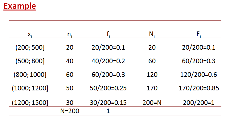 Accumulated relative frequency (): Percentage of observations smaller or equal than the considered value. It is calculated by dividing the accumulated absolute frequencies by the sample size.